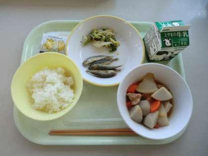 今日の献立は、「牛乳、ごはん、こあじのからあげ、ブロッコリーのごまあえ、さといもとぶた肉のうま煮、黒糖だいず」です。