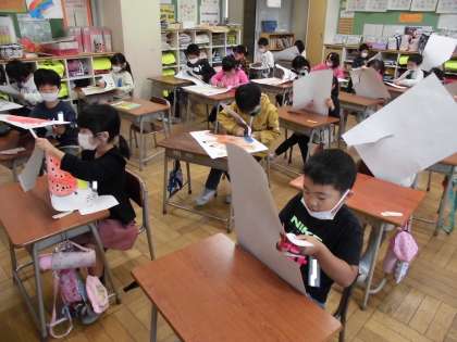 のってみたいものや自分を描いた子供たち。今日は作品を切り取って大きな紙に乗せてみました。「本当に泳いでいるみたい」「草むらをジャンプしているみたい」と話しながら想像を広げていました。この後、周りの世界を描いていきます。