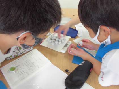 中の写真は、理科「物の重さをくらべよう」です。粘土の形を変えると重さも変わるのかを調べています。