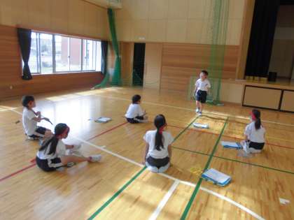 下の写真は、体育科「チャレンジなわとび」です。連続組合せ跳びに挑戦しているところを団で見せ合っています。