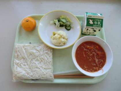今日の献立は、「牛乳、ソフトめんのミートソースかけ、フレンチサラダ、蒸しパン、みかん」です。