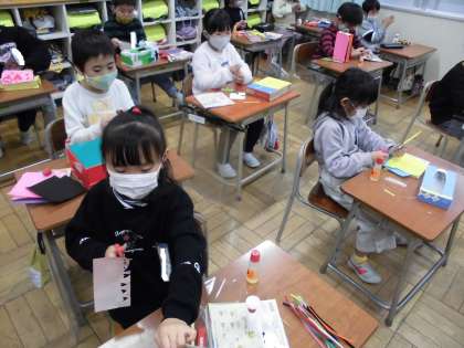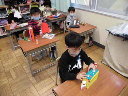 初めてボンドを使って作業をしています。どうすればくっつくのか試行錯誤しながら取り組んでいます。