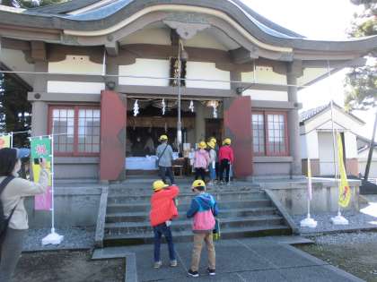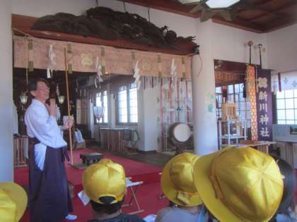 新川神社では、宮司さんから本殿内にある龍の秘密を聞いたり、狛犬がマスクをしているのを見つけたり、どべについて語り合ったりと、神社について関心を高めていました。