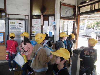 東新庄駅では、車を間近で見て、屋根について部品に興味をもったり、改札の様子を観察したりして、普段利用することの少ない公共交通機関に興味をもったようでした。