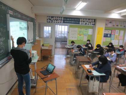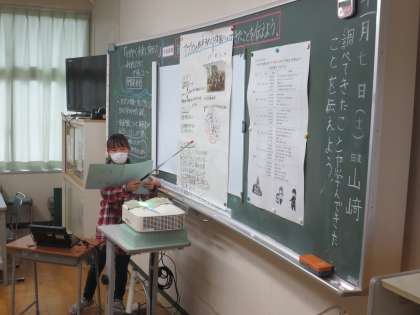 総合的な学習の時間に「戦争と平和」について考える学習を進めてきました。子供たちは自分の学習課題の解決に向けて熱心に調べ、学んだことや考えたことを分かりやすく伝えるために資料を作成しました。今日の学習参観の場で、しっかりと発表する姿はとても立派でした。