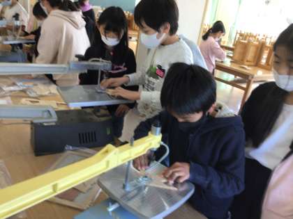 図画工作科では、電動糸のこぎりを使って木の板を切っています。安全に気を付けて、丁寧に切り進めています。