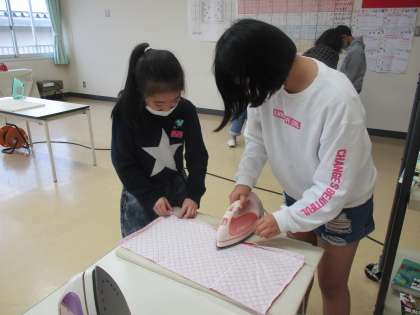 家庭科では、ウォールポケットを作っています。アイロンかけをした後、ミシンで縫います。