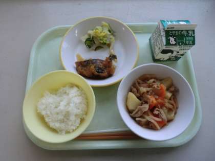 今日の献立は、「牛乳、ごはん、あげさばのみぞれだれ、はくさいのゆずあえ、肉じゃが」です。