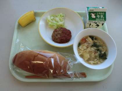 11月12日(木)の給食 公開日 2020/11/12 更新日 2020/11/12 給食室 今日の献立は、「牛乳、黒糖コッペパン、ハンバーグのケチャップ味、ゆでキャベツ、かきたまスープ、バナナ」です。