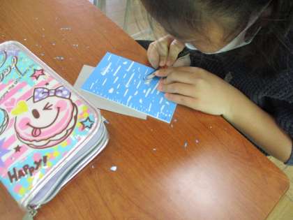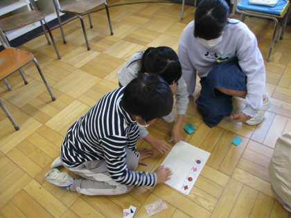 下の写真は外国語活動です。形の言い方を学習しています。ほしい形を伝える表現を使って飾りを集め、家族にありがとうカードを作る予定です。
