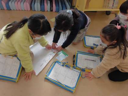 中の写真は社会科です。学校にある消防施設を調べ、グループでまとめているところです。
