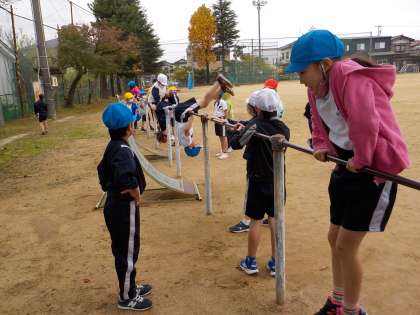 ぶらさがる技やあがる技、まわる技など、自分の挑戦したい技に一生懸命取り組んだり、友達と教え合ったり励まし合ったりする姿が見られています。
