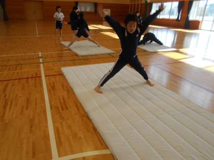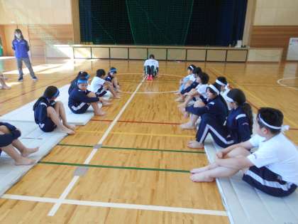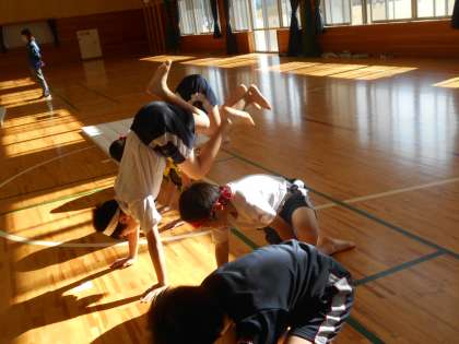 外部の先生を招いて、マット教室を行いました。後転や側転の仕方をわかりやすく教えてもらい、やる気いっぱいで取り組んでいる子供たちの様子です。