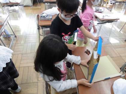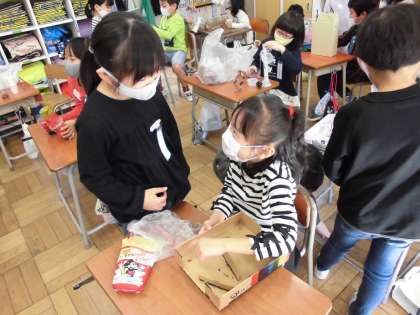 生活科の学習で、あきのおもちゃを作っています。今日は友達に実際に試してもらい、アドバイスをもらったり、よさを伝えてもらったりしました。