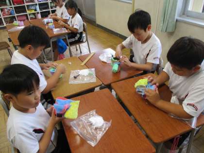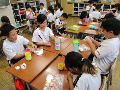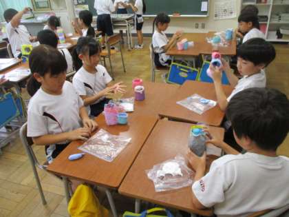 図画工作科では、空き容器に紙粘土を貼り付けて小物入れを作りました。紙粘土に絵の具を混ぜ、色づくりを楽しみながら飾り付けを行いました。素敵な作品に仕上がりました。