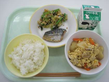 今日の給食は ・ごはん ・牛乳 ・鯖のみそ煮 ・炒り大豆和え ・卵とじ です
