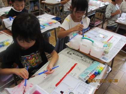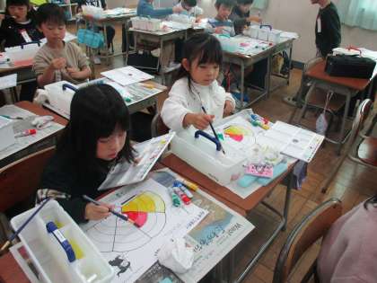 子供たちは、初めて水彩セットを使いました。くじゃくの羽の部分を絵の具で塗りました。水を少しずつ増やして、色の変化を楽しみました。