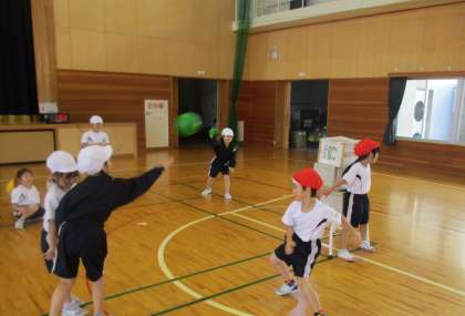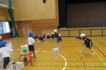子供たちは体育科の学習でボール投げゲームに取り組んでいます。的をしっかりと狙い、一点でも多く得点を取ろうと一生懸命頑張っています。どのように攻めたり守ったりするのかチームで作戦を立てるなど、協力して取り組む姿勢も見られました。