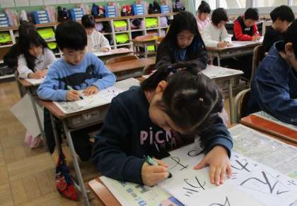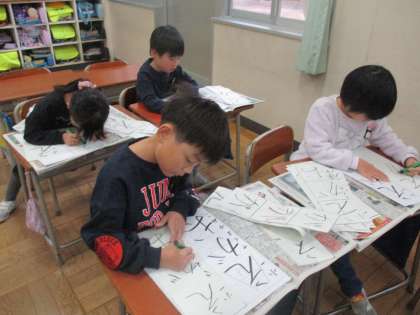 子供たちは、初めての硬筆墨を使い、「えがお」という文字を書いています。姿勢に気を付けながら書く姿、はっきり・大きく・丁寧に書く姿など、一人一人が集中して取り組んでいます。