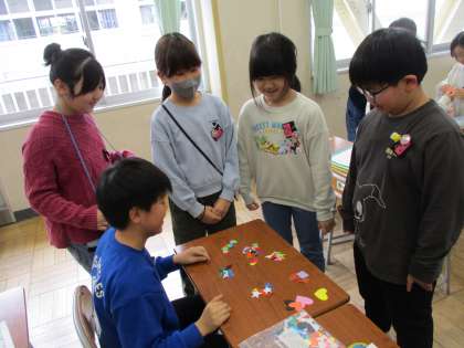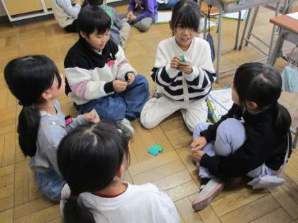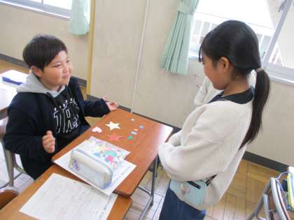 外国語活動では、自分だけのネームプレートを作っています。ネームプレートの飾りを手に入れるために、欲しい物を伝える表現を練習したり、学習した表現を使って買い物をしたりしています。