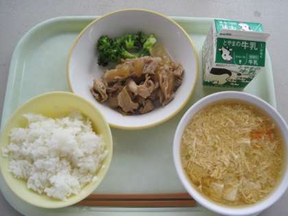 給食室では、豚肉といっしょに玉ねぎを、ショウガ汁としょうゆで