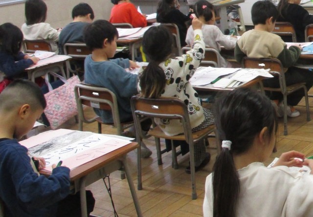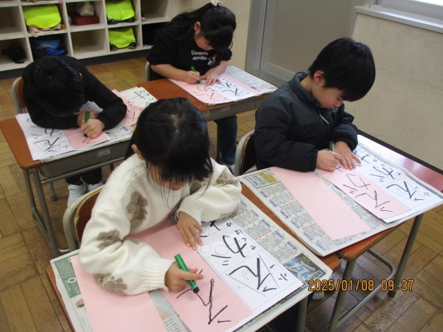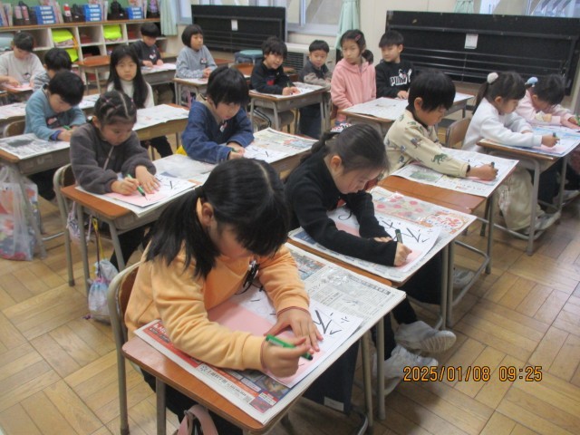 1年生にとって初めての書き初め大会。硬筆墨を持ち、1つ1つ丁寧に字を書いていました。