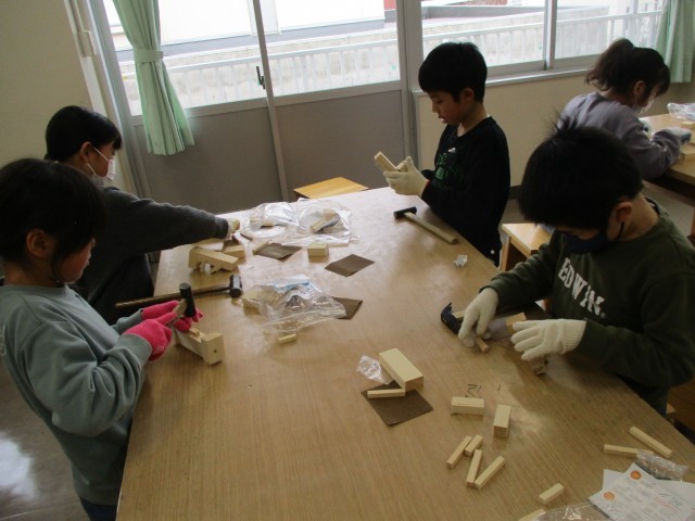 図画工作科では、くぎを打つ練習をしました。くぎが曲がったり木に深く打ち込むことができなかったりして、苦戦する姿も見られましたが、だんだんとくぎ打ちが上達してきました。作品を持ち帰っていますので、ぜひご覧ください。