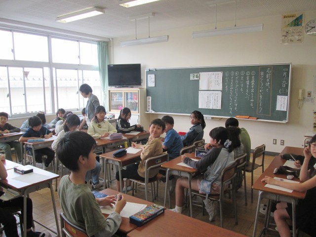 5年1組の学習参観の様子です。国語科『名前を使って、自己しょうかい』の学習を行っています。