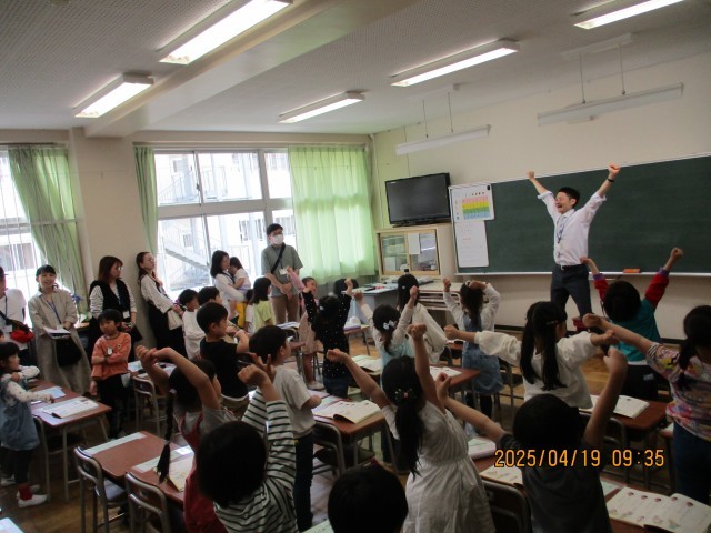 1年4組の学習参観の様子です。国語科「うたに あわせて あいうえお」の学習を行っています。