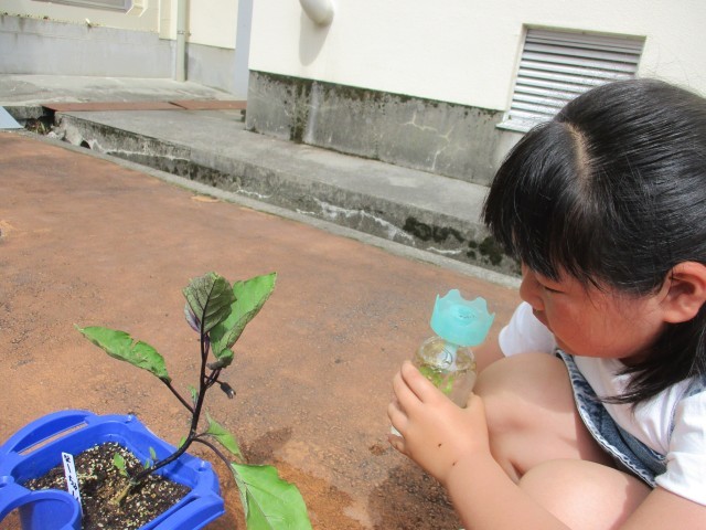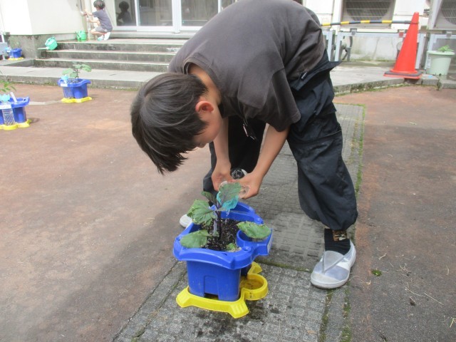 連休明けに植えた野菜のお世話をしています。「花が咲いたよ」「つるがのびてきた!」と嬉しそうに話す声が聞こえてきます。野菜の様子をよく観察している2年生です。