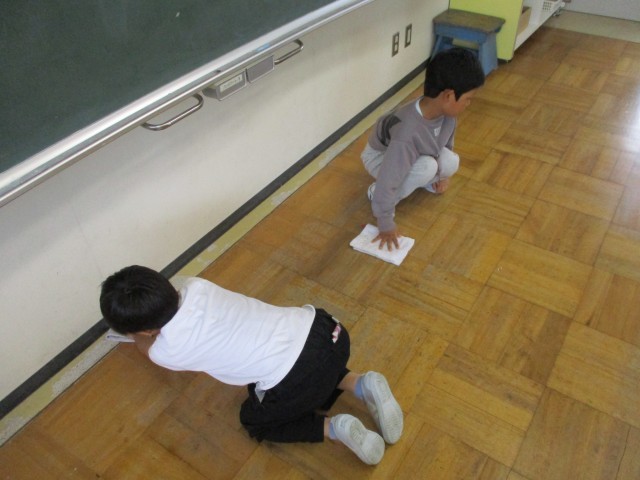 朝の時間には、「自分のために」「みんなのために」できることを実践しています。朝顔を見に行った後、みんなのために掃除をしている子供たちです。