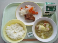 今日の給食は・ごはん ・牛乳・豚肉の香り揚げ・ピクルス・野菜のスープ煮・ポケ...