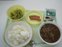 今日の給食は・カレーライス(ごはん カレールウ)・牛乳・福神和え・フルーツミック...