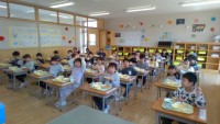 4月13日 1年生 はじめての給食1年生は、はじめての給食を食べました。みんなで力を合わせ、準備や片付けを行い、たのしい給食時間になりました。