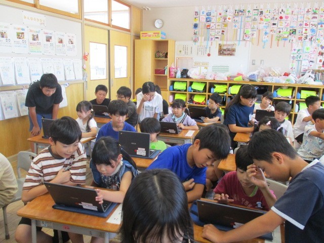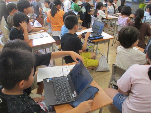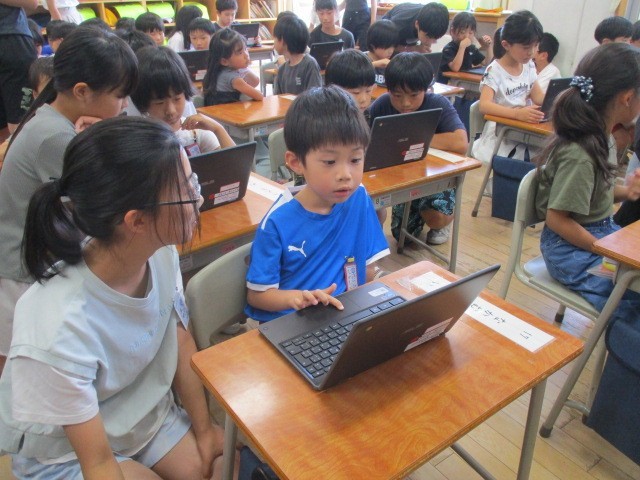 1学期を振りかえって、生活アンケートをしました。6年生に質問を読み上げてもらい、クロームブックで、入力をしています。「いつもはどうしているの。」「ここをおすよ」など、操作を一緒にしながら、答える1年生。6年生の優しさに笑顔が広がりました。