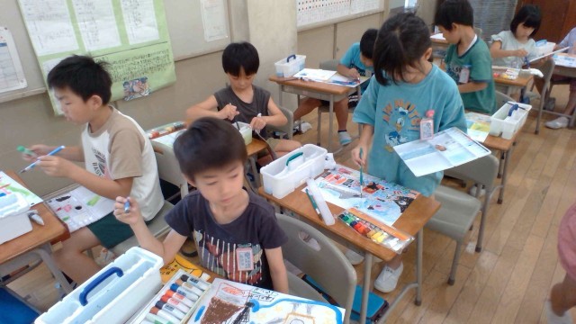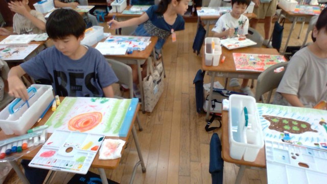 図画工作科「おはなしから 生まれたよ」の学習で、水彩絵の具を用いて色を塗りました。水の量をに気を付けて工夫して仕上げました。