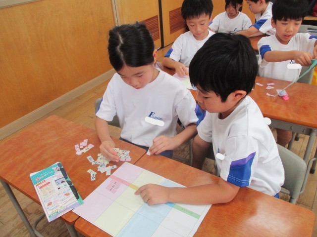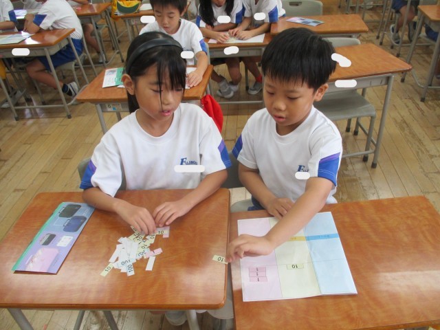 算数科の学習では、たし算の筆算の仕方を、位取り板を使って考えました。十の位に10が10個以上になったときは、100にして百の位に繰り上げることを、操作活動をとおして学びました。