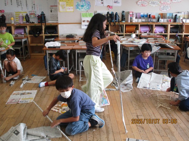 図画工作科「組んで 立てて つなぐんぐん」では、新聞紙やわりばしを組んだり、立てたり、つないだりして、偶然うまれる形を楽しみました。一人で、新聞紙を何枚もつないで長くしたり、友達と新聞紙を組んだりと自分の思いのままに活動しました。