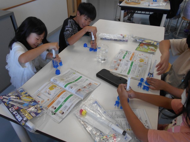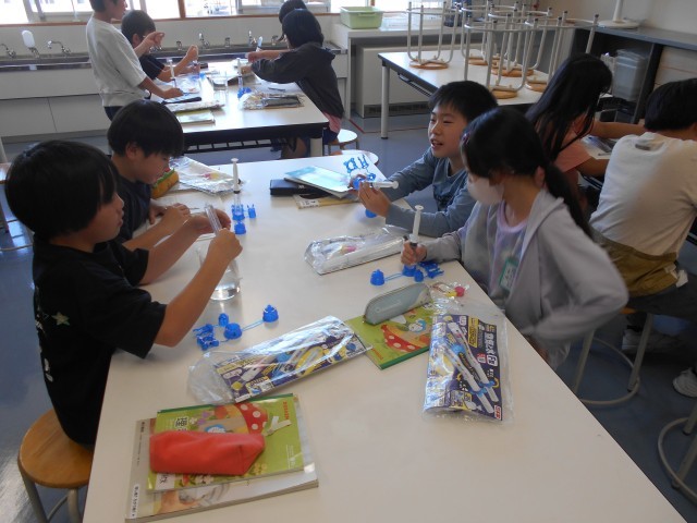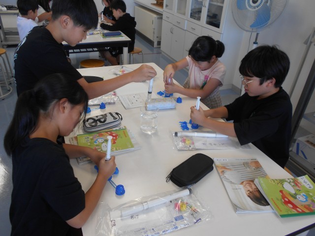 理科の「とじこめた空気と水」の学習では、「閉じ込めた水は体積が変わるのか」という課題のもと、実験を行いました。多くの子供たちは、以前の学習で空気の体積が変わることを知っていたため、「水も同じように体積が変わるのではないか」と予想していました。しかし、実際におしても体積が変わらないことを確かめると、「えっ、変わらない!」「水ってすごい!」と驚きの声を上げる姿が見られました。