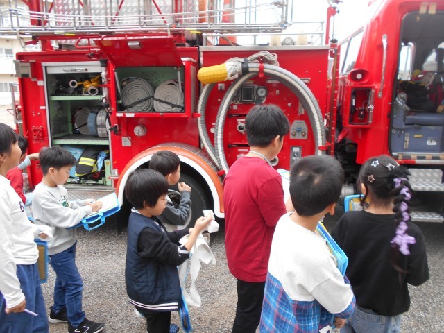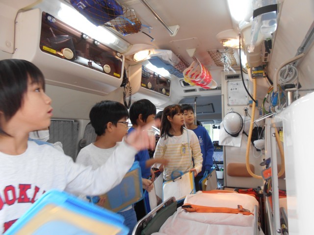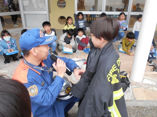 普段、見ることのできない救急車の中や、消防車の様々な装備を見たりしながら、消防の仕事に対する理解を深めていました。また、防火服や呼吸器の着用体験もさせていただき、消防士の仕事がどれだけ大変かということ実感していました。