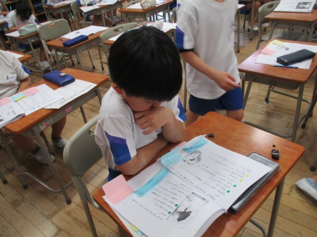 国語科では、自分と登場人物を比べながら『お手紙』のお話を読む学習をしています。今日は、がまくんが手紙を待つことにあきあきしているのに、かえるくんが何度も手紙を待つことを催促する場面について考えました。「かえるくんは、どうして自分で手紙を書いたのに秘密にしているのかな。ぼくなら言う」「手紙を待っても来ないから、もう待つことが嫌になってお昼寝をしたんじゃない?」等と付箋に思ったことを書いたり、話し合ったりして自分と比べながら読みました。
