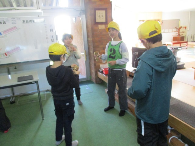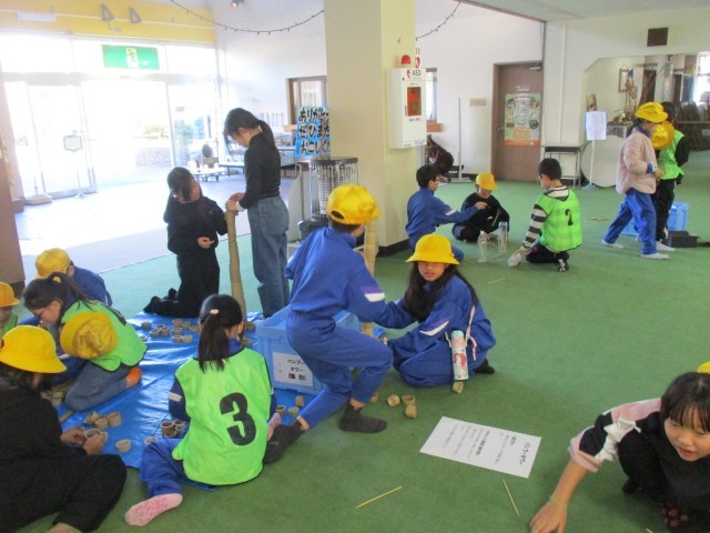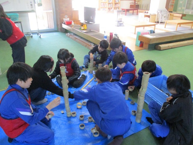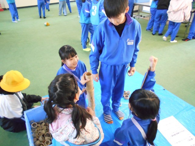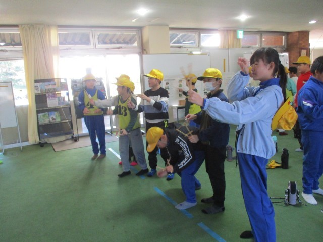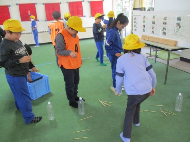 バンブーチャレンジでは、竹を使ったおもちゃを使って4つの種目にチャレンジしました。班の友達と協力する種目や個人でチャレンジする種目があり、みんな楽しく活動していました。
