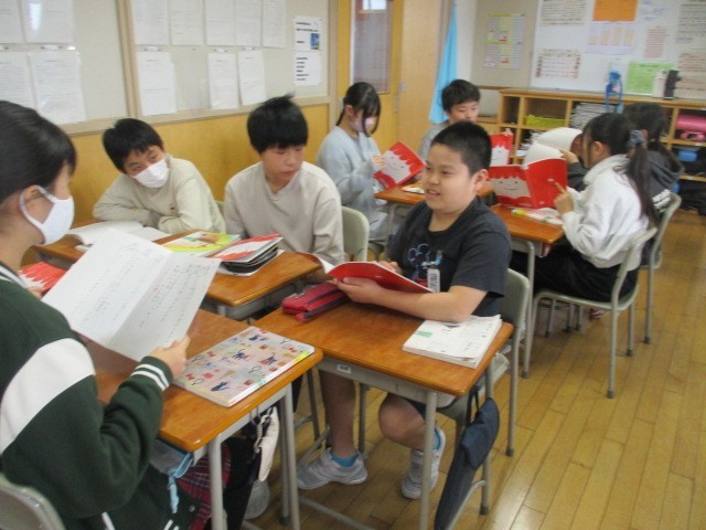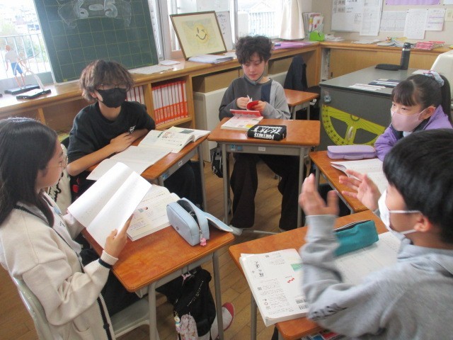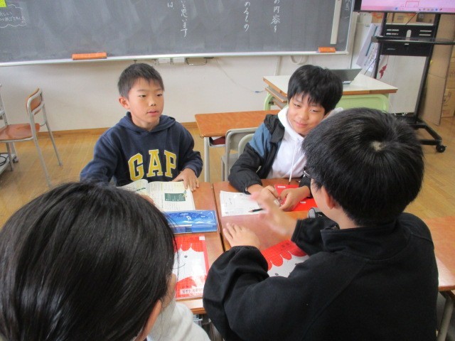 6年生では、国語科で、「みんなが楽しく過ごすために」というテーマで、グループ討議の仕方を学習しています。一人一人が、テーマに沿ったよりよい意見を出し合い、さらによい意見へと練り上げようとしています。
