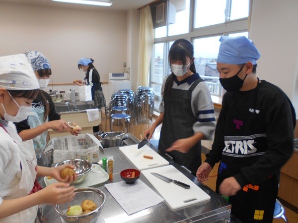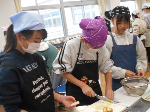 6年生では、家庭科で家族が喜ぶ献立を考えました。子供たちは、栄養バランスやいろどりに加え、家族が好きなもの、つくる時間など様々な観点から献立を考えました。また、学習したことを生かして班でジャガイモを使った献立を1品考え、調理しました。班のみんなで協力しながら手際よくつくり、おいしく食べていました。