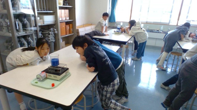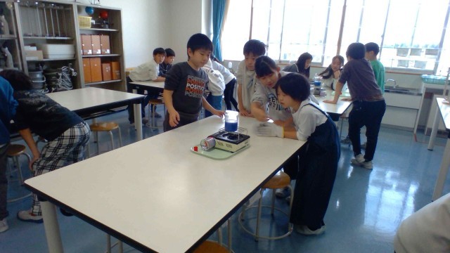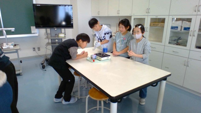 今日は、水のあたたまり方の実験を行いました。示温インクがピンク色に変わっていく様子を観察しながら、子どもたちは「空気とあたたまり方が同じだ」「予想とは違って上からあたたまるんだ」など、さまざまな気付きや発見を口にしていました。
