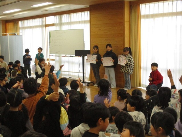 2学期最後の学年集会は、5組が中心になって進めました。ゲームは、「本物はだれだ」と「おえかきリレー」でした。前に3人が出てきて、「今日の日直はぼくです。」と同じセリフをいって、本物がだれかを当てると、大喜び。また、お絵かきでは、担任の似顔絵をパーツごとにリレーで描きました。完成した絵を見て、大盛り上がり。笑顔がいっぱいの時間になりました。