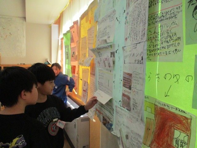 生活科「まちたんけん」でまとめた新聞を違うクラスの友達にも新聞を読んでもらいました。いろいろな友達に読んでもらい、嬉しそうな子供たちでした。