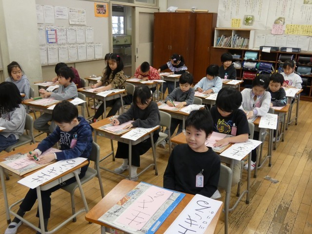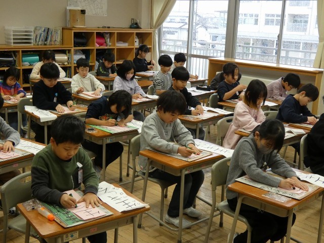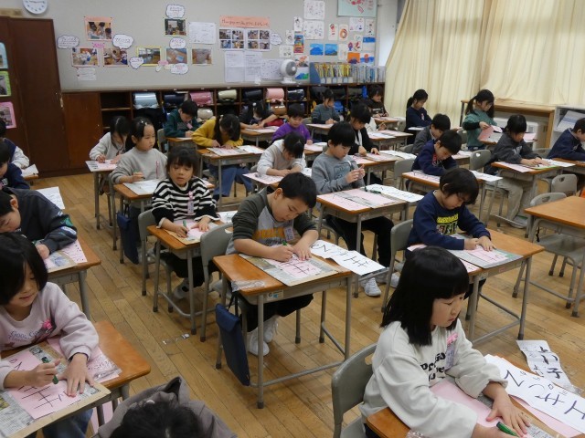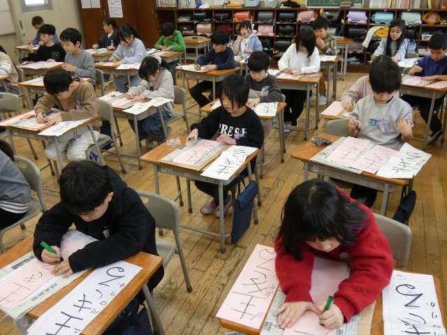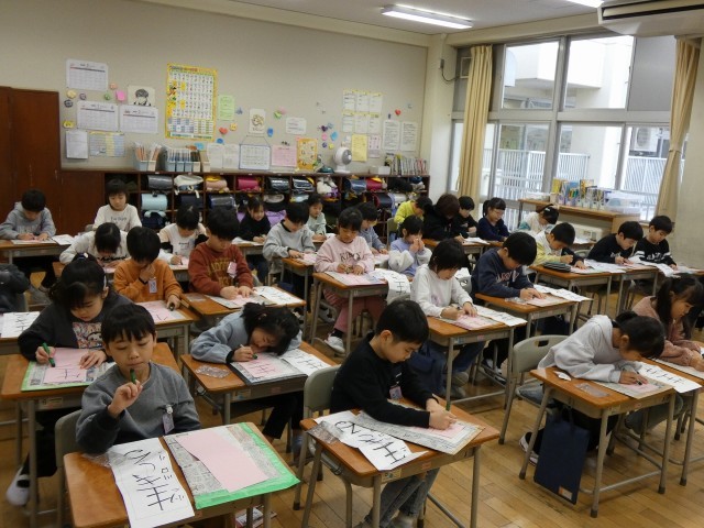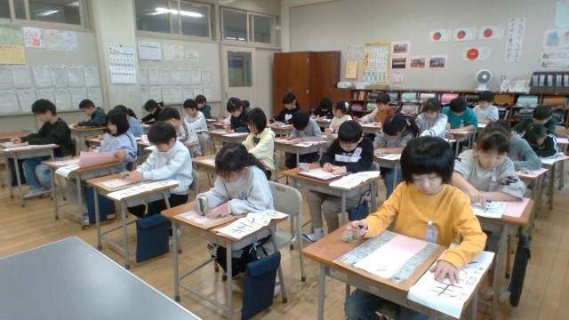 書初大会がありました。今までに練習してきた成果を発揮し、一画一画に気持ちをこめて真剣に取り組んでいました。