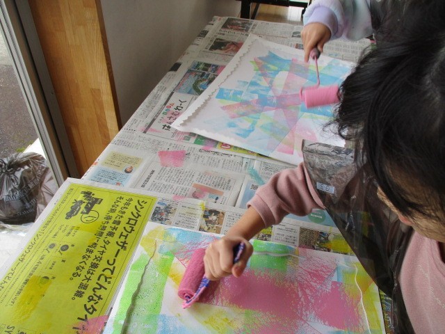 三学期の図画工作科の学習は、版画からスタートです。ステンシルローラーを使って、カラフルな版画を作っています。まずは、下地を塗ります。4色のインキを使い、ローラーの動きを楽しみながら塗りました。