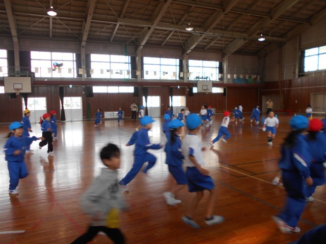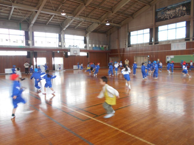 今日、体育科の学習で様々な種類のおにあそびと、ボール投げゲームをしました。子供たちは、体育館を思い切り走り回り元気よく活動していました。